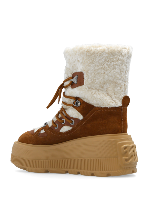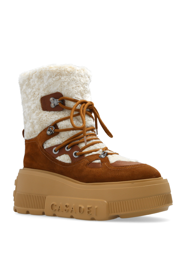 Brown and cream ‘Nexus Skipass’ platform boots from Casadei. Crafted from calf suede and faux-fur, this lace-up model sits on a beige rubber sole with a logo.