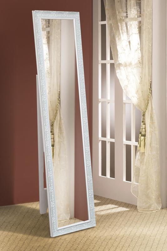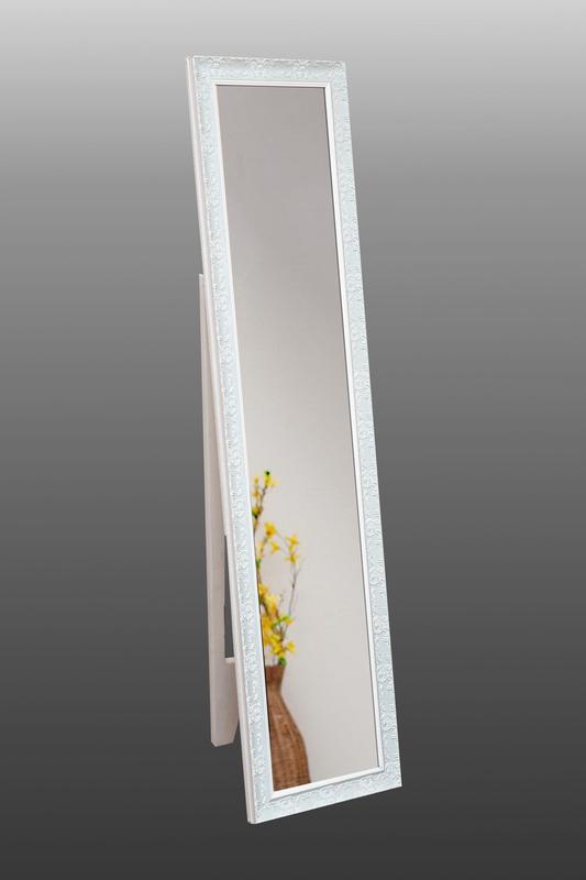 на підлогу. Дзеркало виконано в стилі "Прованс" у блакитно - білому кольорі.Білий колір підтримується і задньою стінкою яка виконана в білій еко-шкірі з