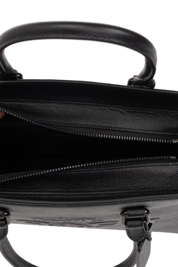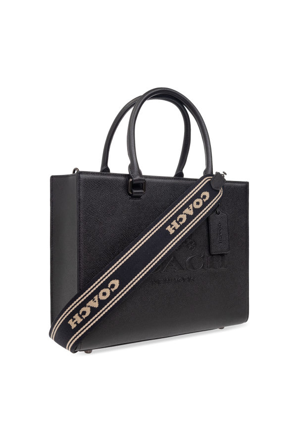 Black shopper bag from Coach. Made of canvas and leather, this model fastens with a zip and is decorated with a tactile logo. It is complete with two half-round handles, a detachable and adjustable shoulder strap in black and beige with a logo embroidery and one internal compartment with one zip pocket and two slip pockets.