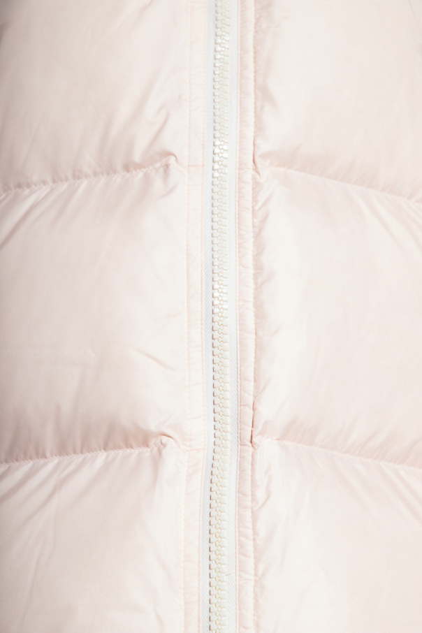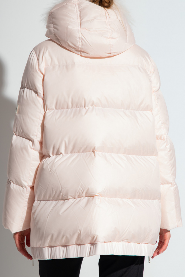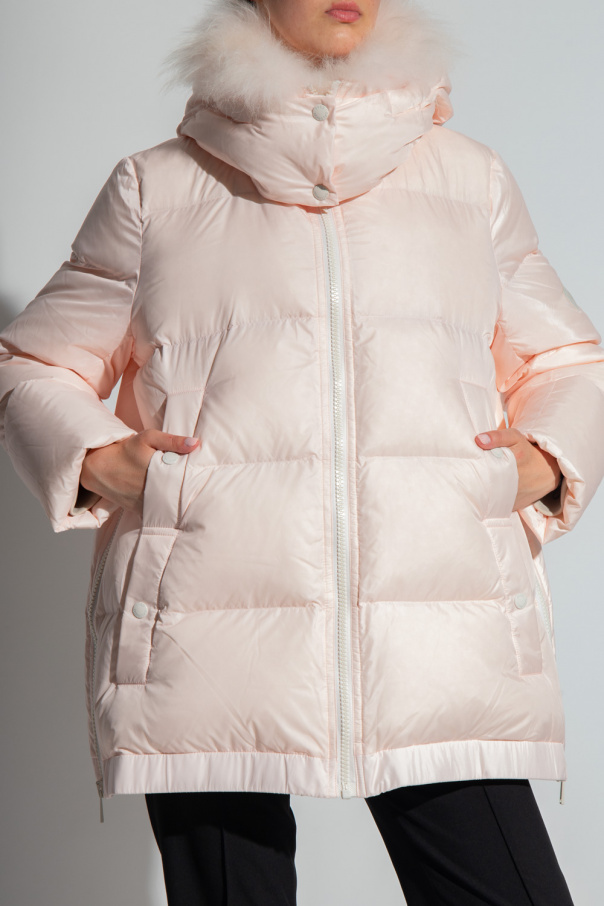 Light pink quilted down jacket from Yves Salomon, the ‘Army’ line. Fastened with a zip, this garment is complete with a collar with detachable lamb fur, four snap-fastened front pockets, zips on the sides, detachable hood and long sleeves. Has insulating properties up to -20°C.