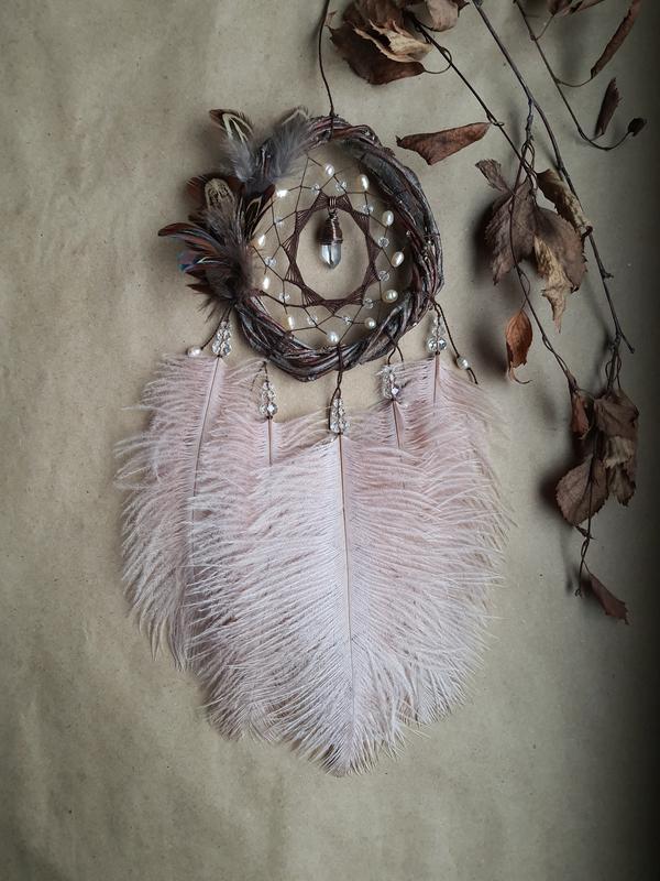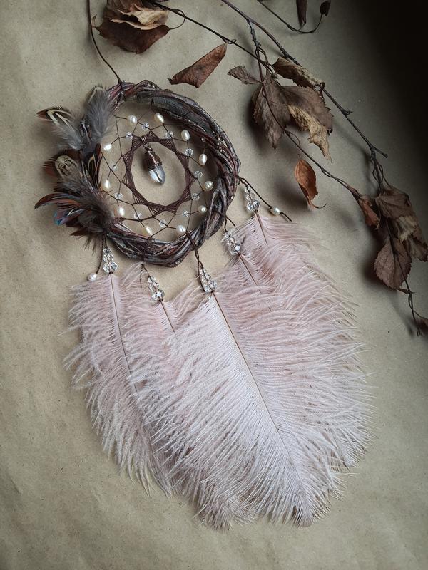 Ветви березы, жемчужины, стеклянные бусины, кристалл горного хрусталя в миди, перья страуса и фазана