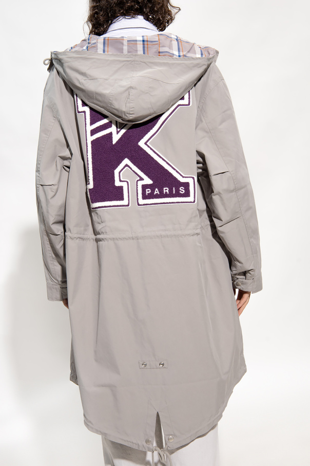 Grey parka from Kenzo. Crafted from a cotton blend, this style fastens with a zipper and snaps and showcases a drawcord-adjustable hood, waist and hem, purple and white logo-shaped patches, two flapped pockets with snaps and long sleeves with snap-fastened cuffs.