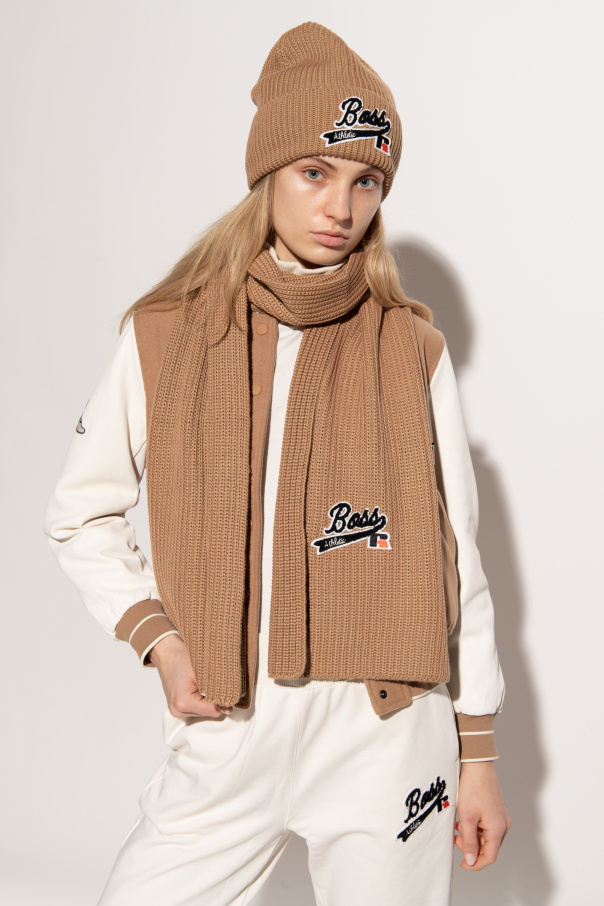 Brown scarf from BOSS x Russell Athletic. Crafted from a wool blend with a ribbed texture, this item showcases a black, white and orange logo patch for brand recognition.