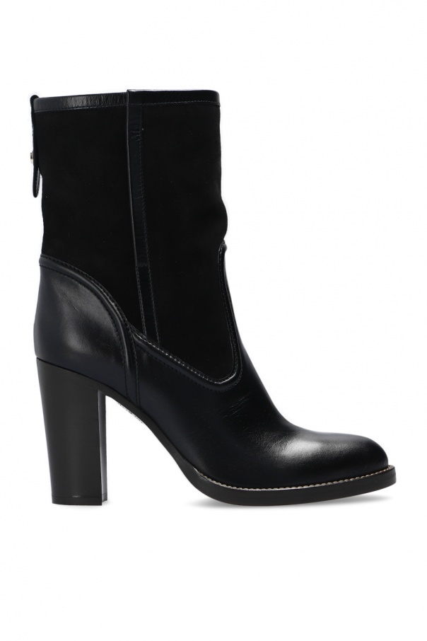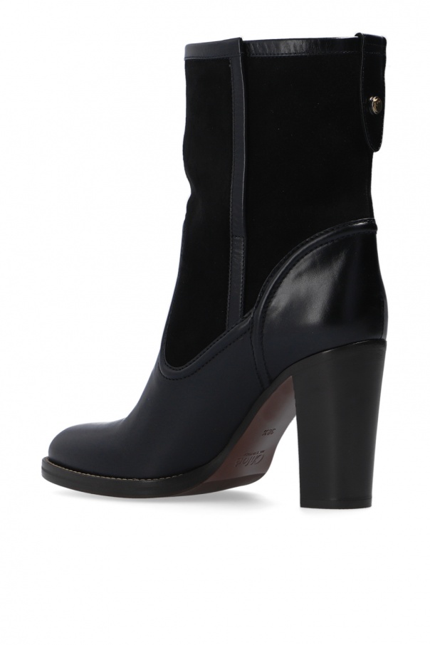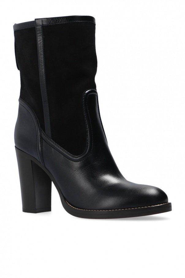 Black heeled ankle boots from Chloé. Crafted from leather and suede, this pair is set on a dark brown sole constructed from leather and rubber.