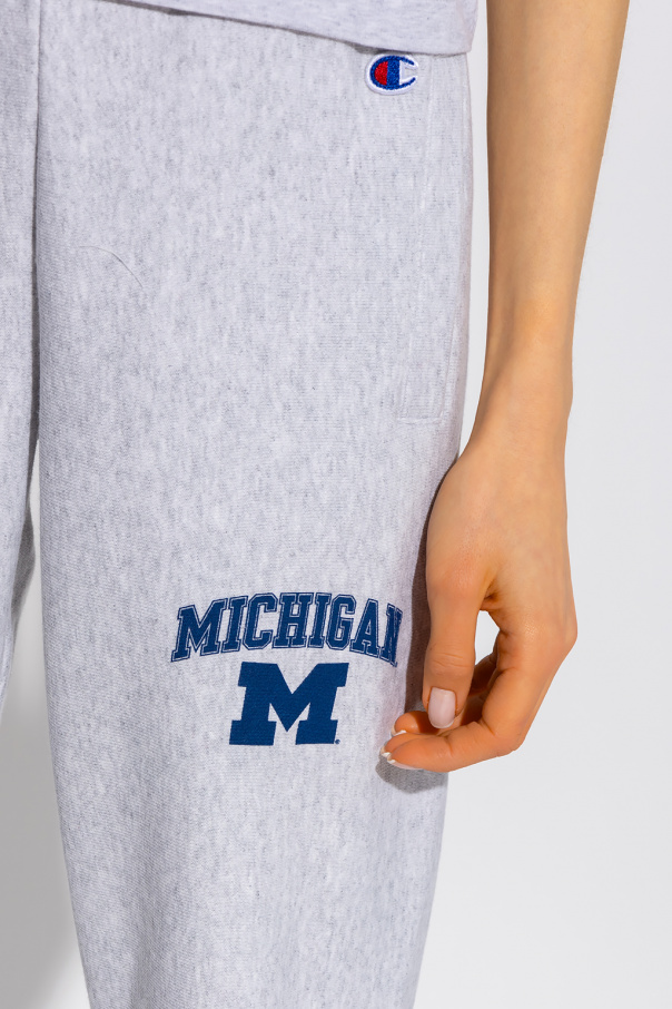 Grey sweatpants from Champion. Enriched by a navy blue ‘Michigan’ print and a logo patch, this pair features an elasticated waistband and cuffs and two slip pockets.