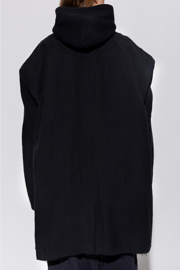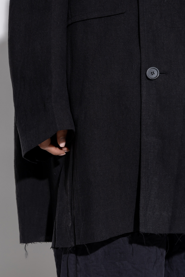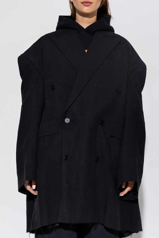Black coat from Balenciaga. Crafted from linen with a double-breasted silhouette, this style features button fastenings, peak lapels, two flapped pockets, long sleeves and a crinkled effect with raw edges.