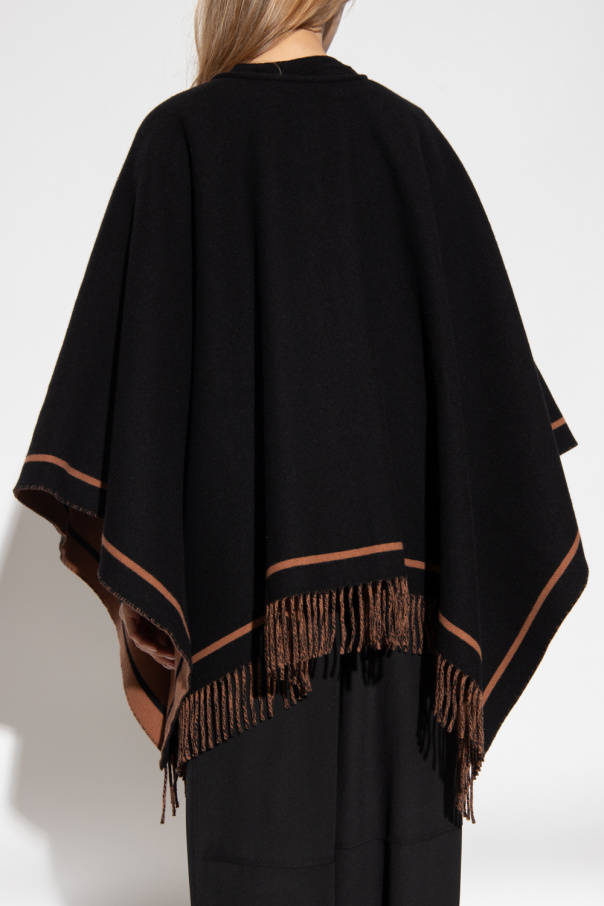 Black and brown poncho from FERRAGAMO. Made of wool, this style features a gold-tone metal Gancini hook closure and a fringed hemline.