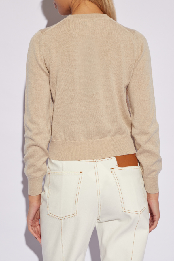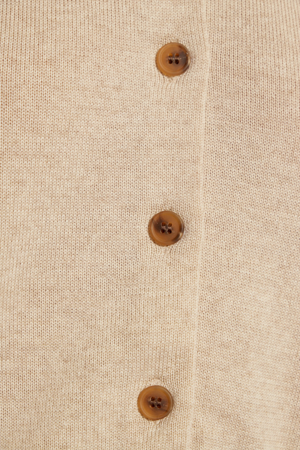 Beige cardigan from Maison Kitsune. Made of wool, this style showcases a logo-shaped patch on the front, button fastenings, long sleeves and ribbed trims on the round neck, bottom hem and cuffs.