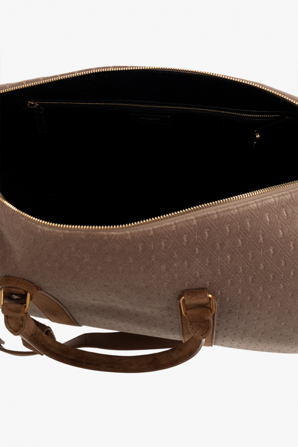 Beige and brown ‘Le Monogramme 48H’ holdall bag from Saint Laurent. Crafted from velvet embossed with a monogram pattern and lamb leather trims. Fastened with a two-way zip, this design features two half-round handles with a padlock on a strap, detachable and adjustable shoulder strap, antique gold-tone metal hardware and one internal compartment with one zip pocket.