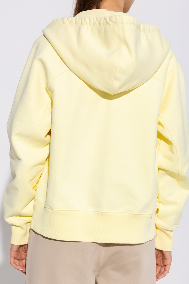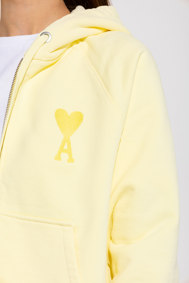 Yellow sweatshirt with a drawcord-adjustable hood from Ami Alexandre Mattiussi. Crafted from organic cotton, this style features a zip fastening, two slip pockets, an embroidered logo on the front and an elasticated bottom hem and cuffs.