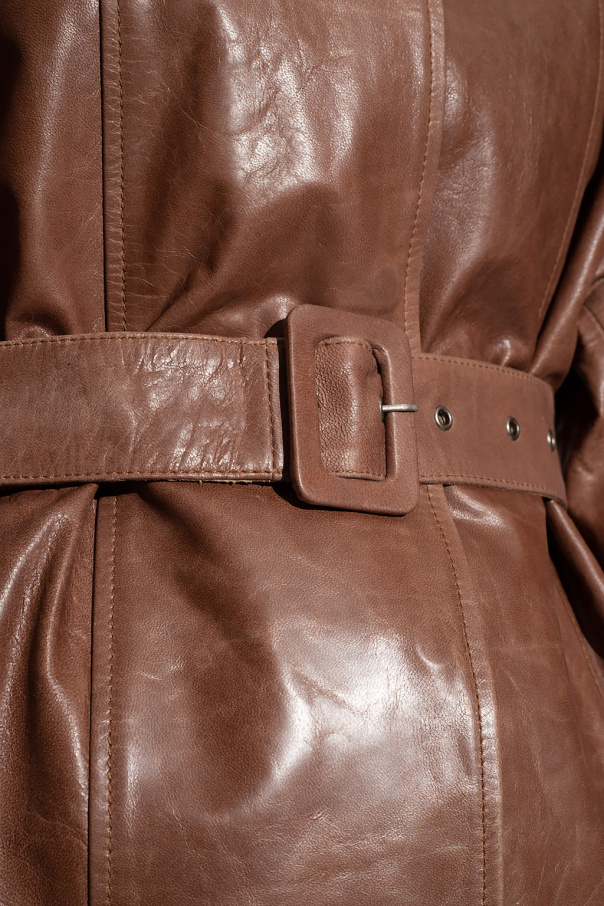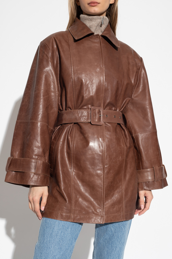 Brown ‘Ruegz’ coat from Gestuz. Crafted from lamb leather, this long sleeve design features snap buttons, drawstring waist and two slip pockets.