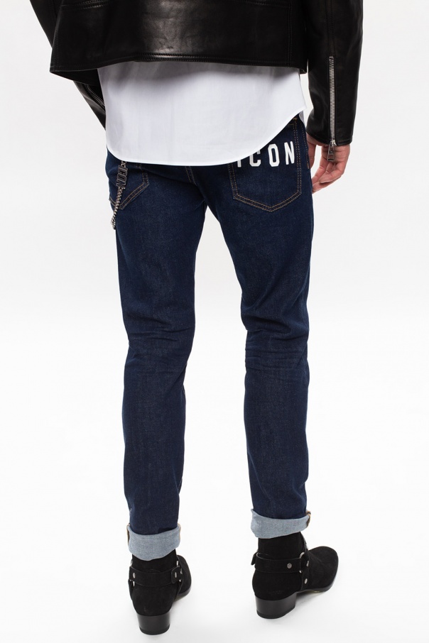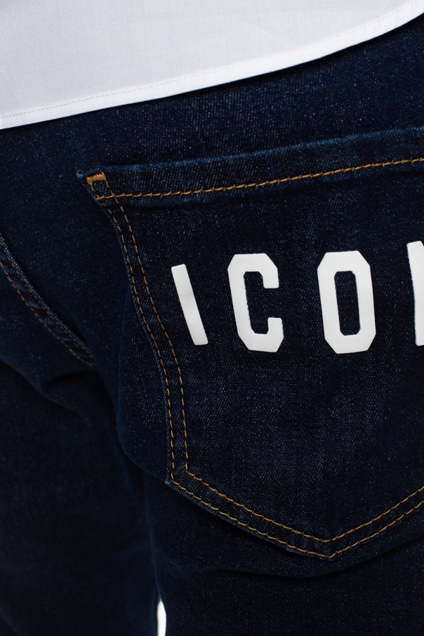 Navy blue 'Cool Guy Jean' jeans from Dsquared2. Flaunting logo patches, ruched details and exposed yellow seams, employs button closing and classic five pockets.