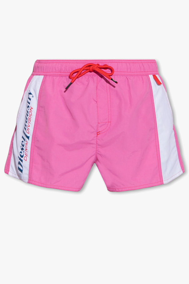 Pink, white and red ‘BMBX-CAYBAY’ swim shorts from Diesel. This pair features an elastic drawstring waistband, navy and red logo pattern, two slip pockets and one velcro-fastened pocket.