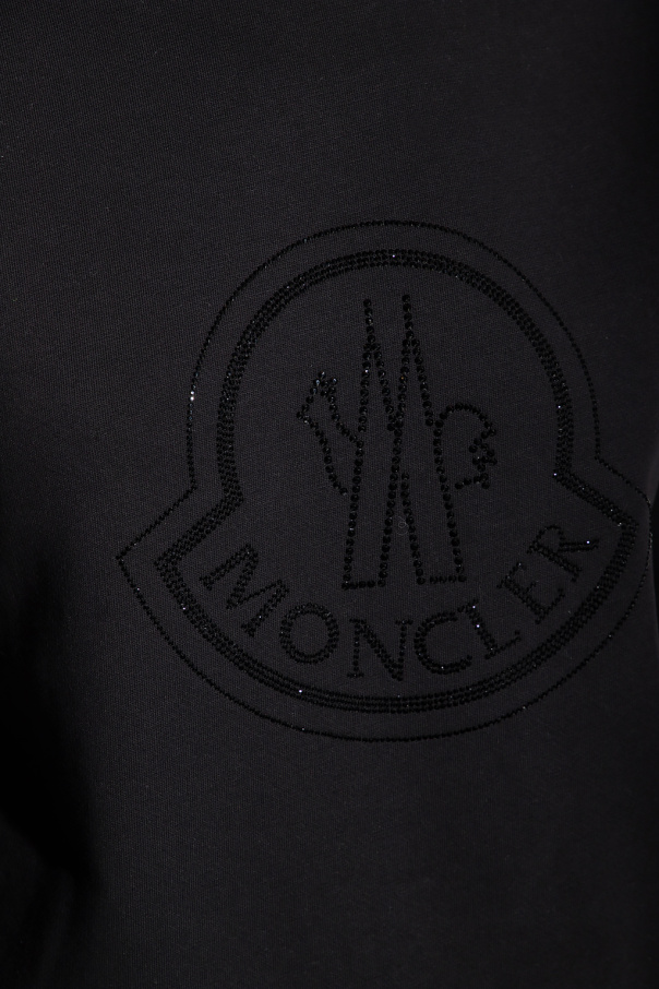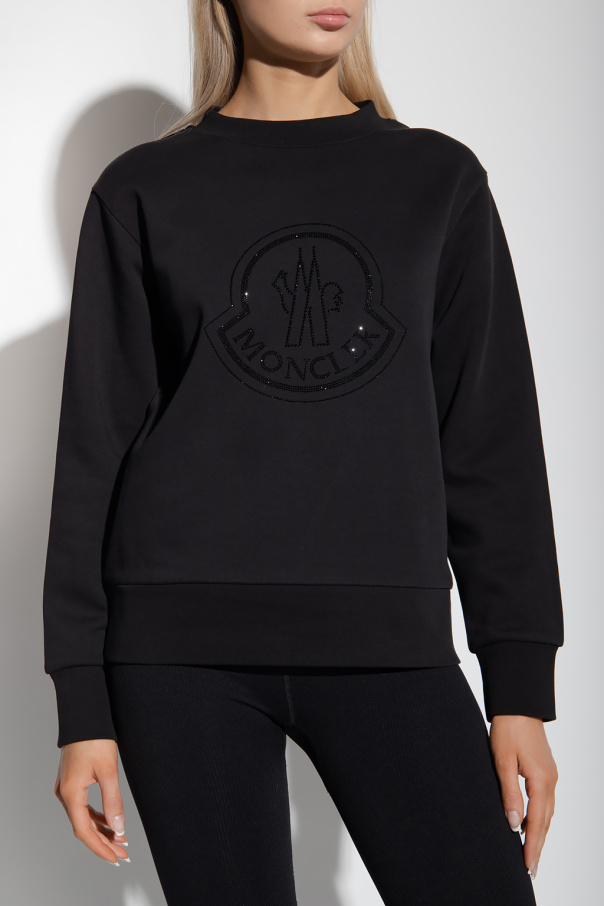 Black crewneck sweatshirt from Moncler. Made of cotton, this style showcases the brand's logo spruced up with glossy rhinestones on the front, long sleeves and ribbed trims on the edges.