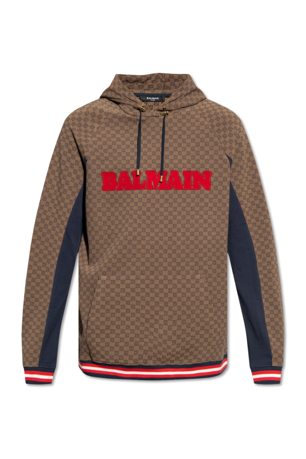 Brown and navy hoodie from Balmain. Crafted from cotton, this garment features a monogram pattern in black, red logo detail with a velvet finish, drawstring hood, front pocket and striped ribbed trims in navy, white and red at the hem and cuffs.