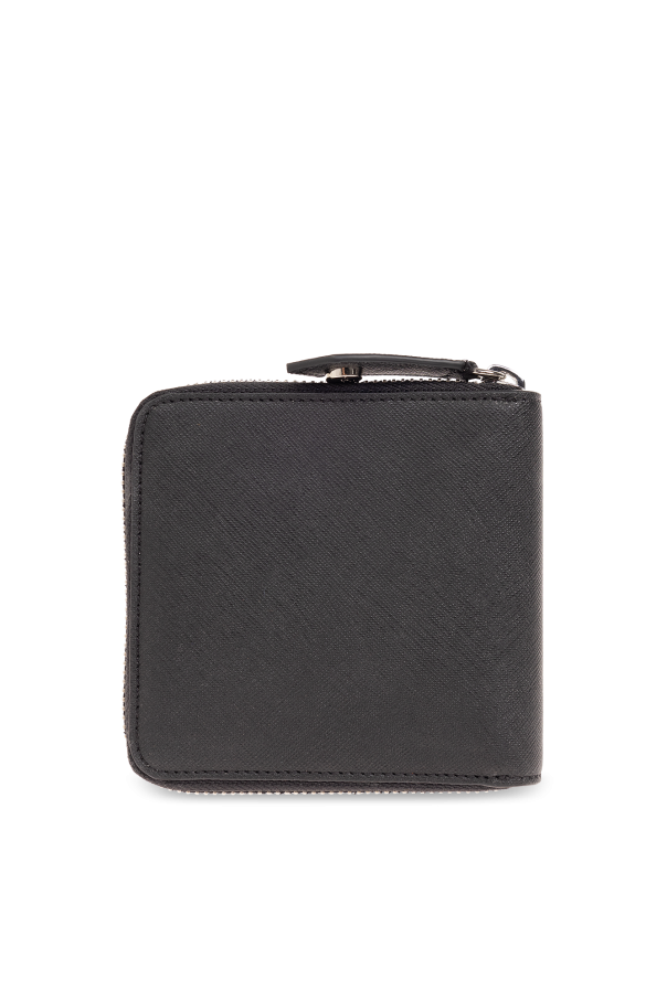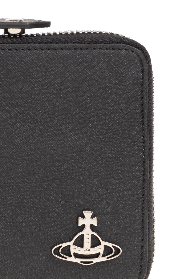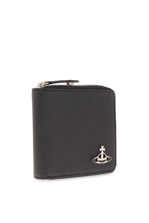 Black wallet from Vivienne Westwood. Made from faux leather, this item fastens via a zip and showcases a metal logo plaque on the front, silver-tone metal hardware as well as one bill compartment, three slip pockets, one snap-fastened coin pocket and three card slots inside.