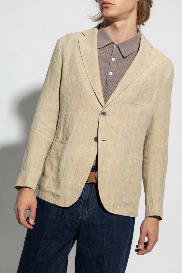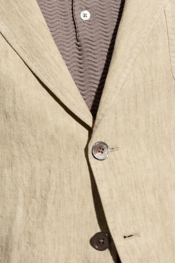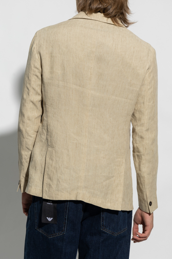 Beige blazer from Emporio Armani. Crafted from linen, this style features button fastenings, notch lapels, long sleeves, three frontal pockets and a double back vent.