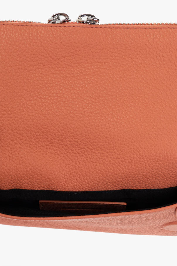 Orange shoulder wallet from Zadig & Voltaire. Made of cow leather, this design secures with a magnetic fastener and features a half-round handle, shoulder strap, silver-tone metal hardware and one internal compartment with a zip pocket.