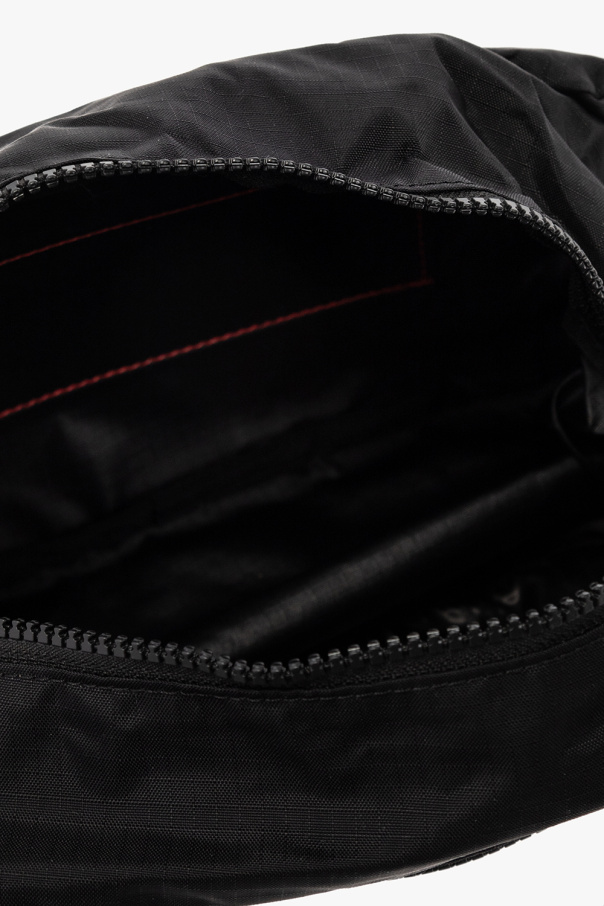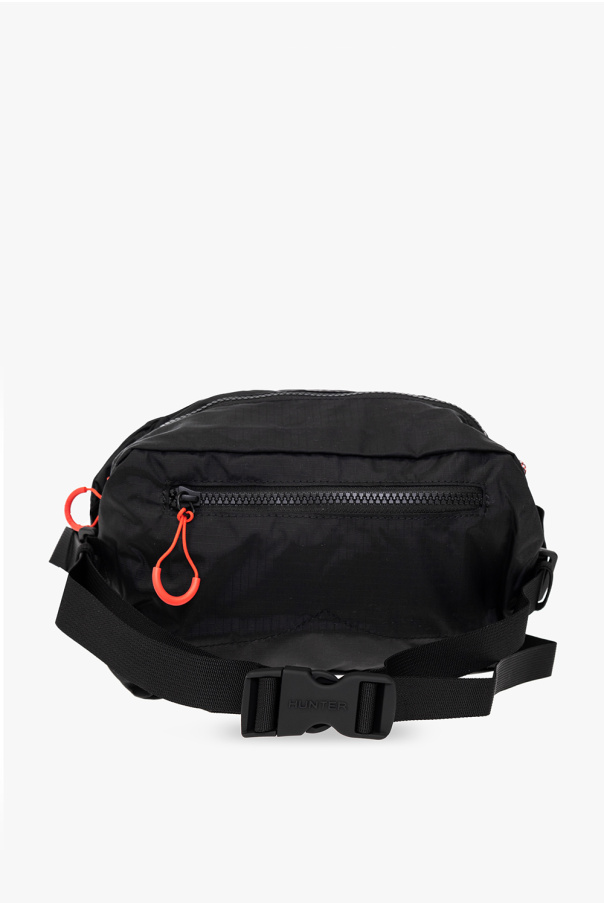 Black belt bag from Hunter. Made of recycled fabric, this design features a two-way zip, rubber patch with a raised logo in white, black and red, zipped back pocket, adjustable strap and one internal compartment.