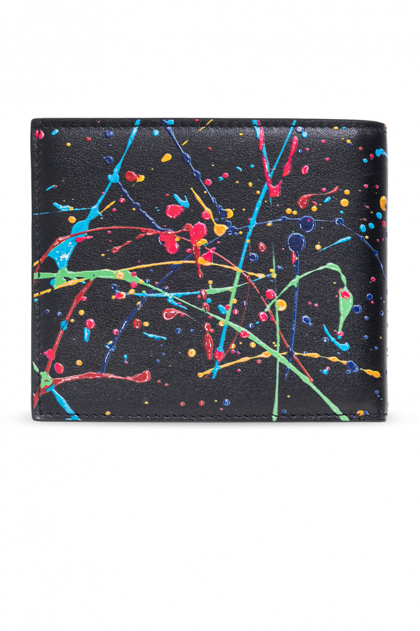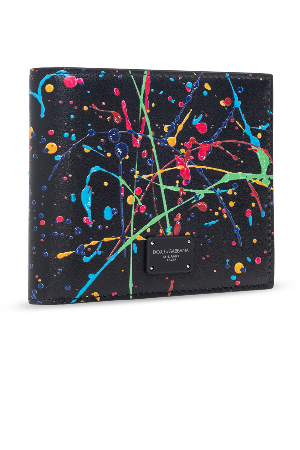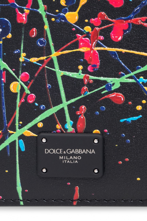 Black folding wallet from Dolce & Gabbana. Made of calf leather, this item is decorated with a multicolored print and logo appliqué. It has a bill compartment, two slip pockets and six card slots.