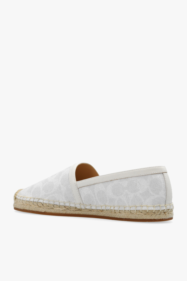 White, grey and beige espadrilles from Coach. Made of leather and fabric, this pair features a logo pattern and beige rubber sole.