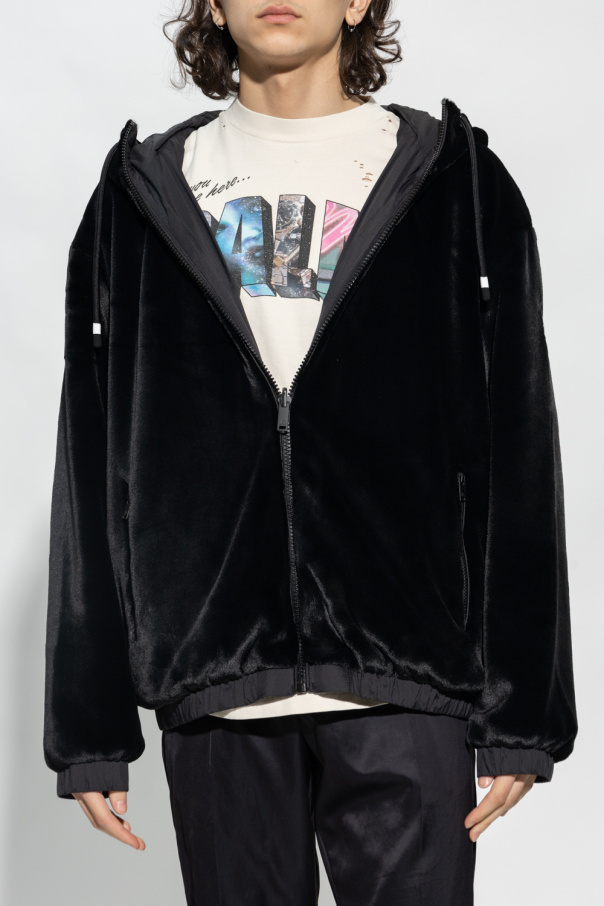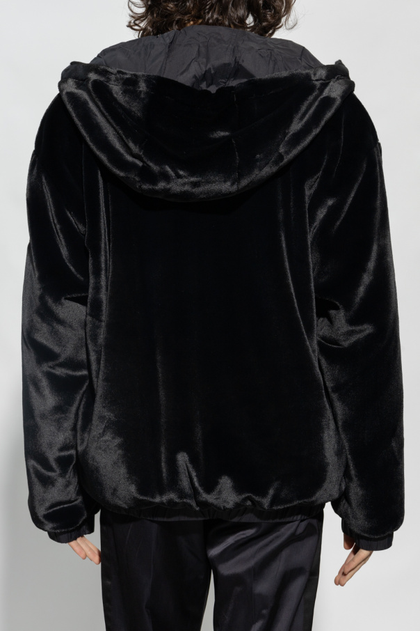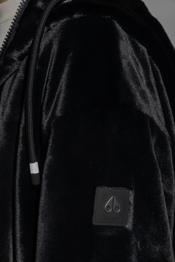 Black jacket from Moose Knuckles. Fastened with a zipper, this style features a drawcord-adjustable hood and long sleeves – one has a logo patch. One side is made of cosy faux fur and features two zip pockets. The other side is plain black and has two slip pockets.
