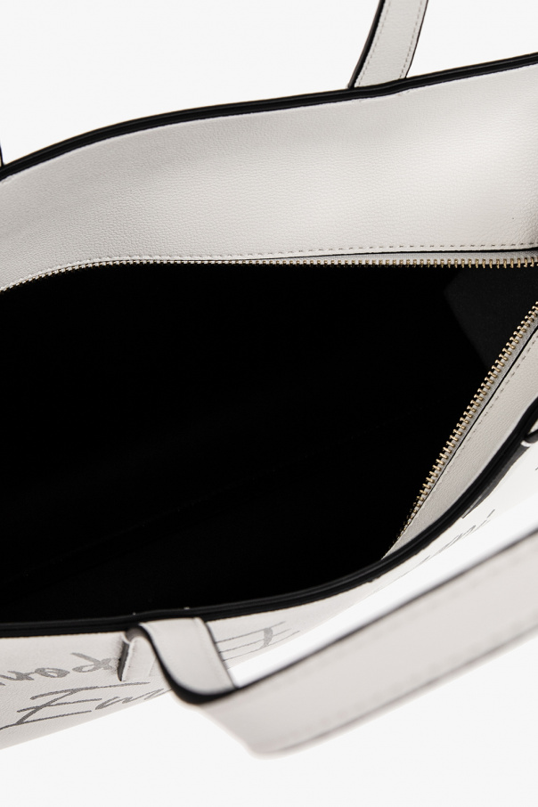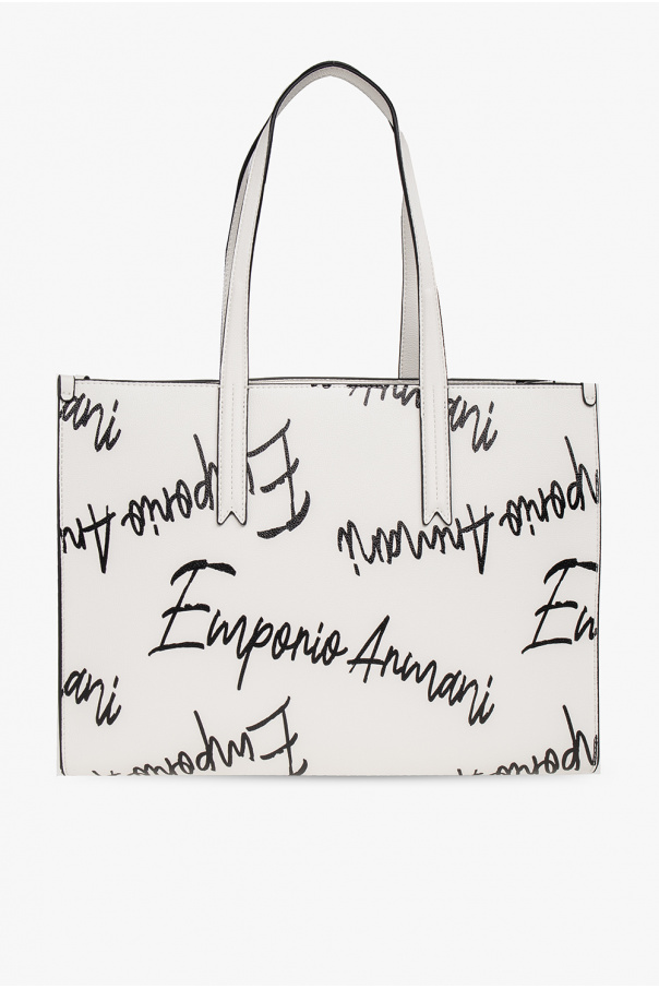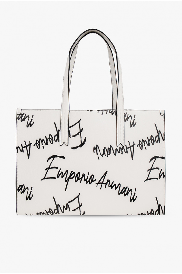 White shopper bag from Emporio Armani. Crafted from faux leather, this design features a zip fastening, a black logo pattern, two half-round handles, light gold-tone metal hardware and one internal compartment.