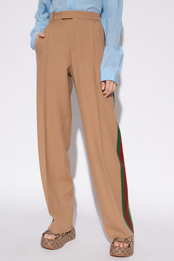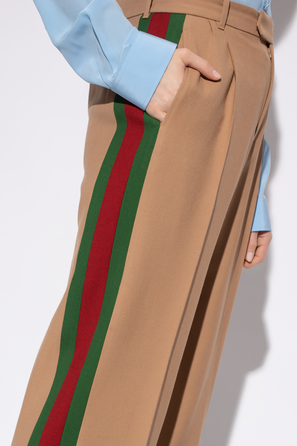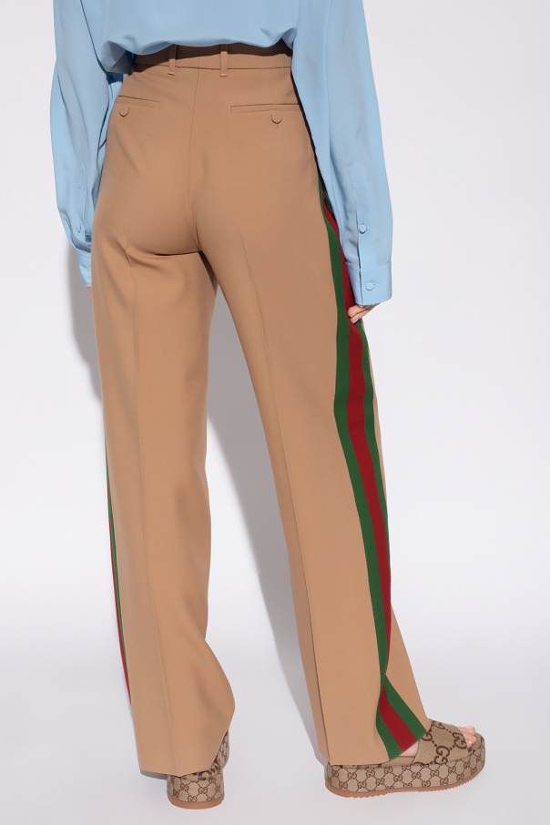 Beige trousers from Gucci. Made of wool, this pair falls with wide legs and features a zip fly with a button and hood, two slip pockets on the front, two button pockets on the back and the brand's signature green and red ‘Web’ detailing down the sides.