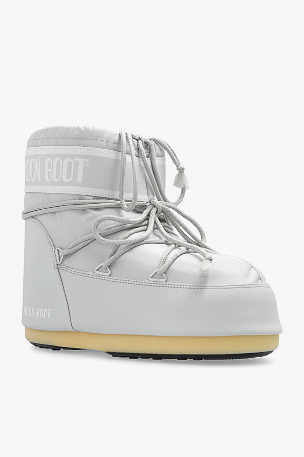 Light grey ‘Icon Low’ snow boots from Moon Boot. This pair features double tie fastenings, logo print and rubber sole in cream and black. Inspired by the peculiar shape and technology of the astronauts’ boots, the iconic style was designed in 1969 after the first Moon landing.