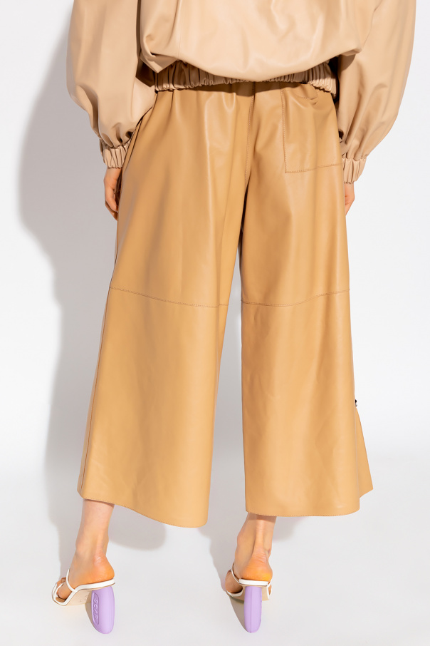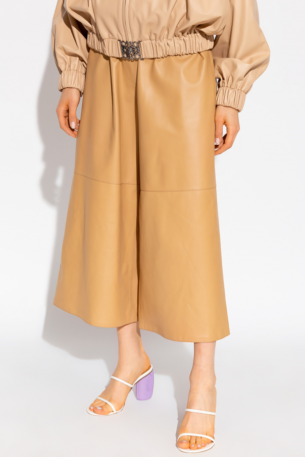 Beige trousers from Loewe. Crafted from leather, this pair falls with slightly flared legs and features an elasticated waistband and three slip pockets.