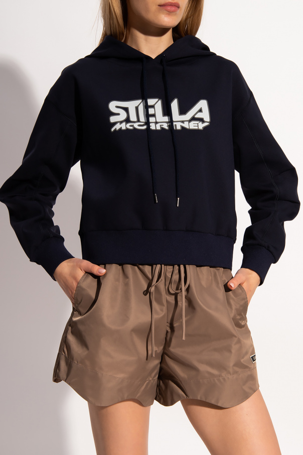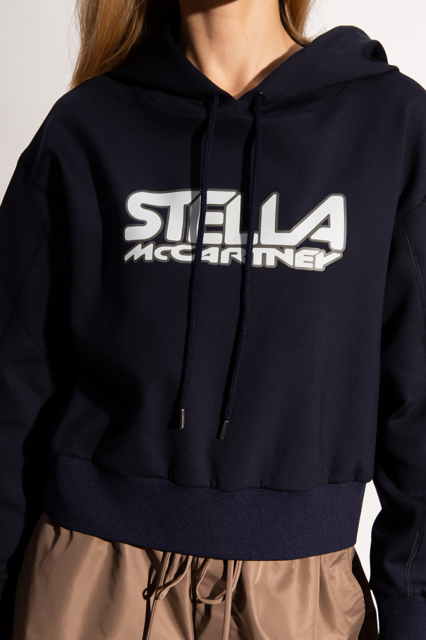 Navy blue sweatshirt with a drawcord-adjustable hood from Stella McCartney. Printed with the brand's logo in white and grey, this hoodie features a ribbed bottom hem and cuffs.