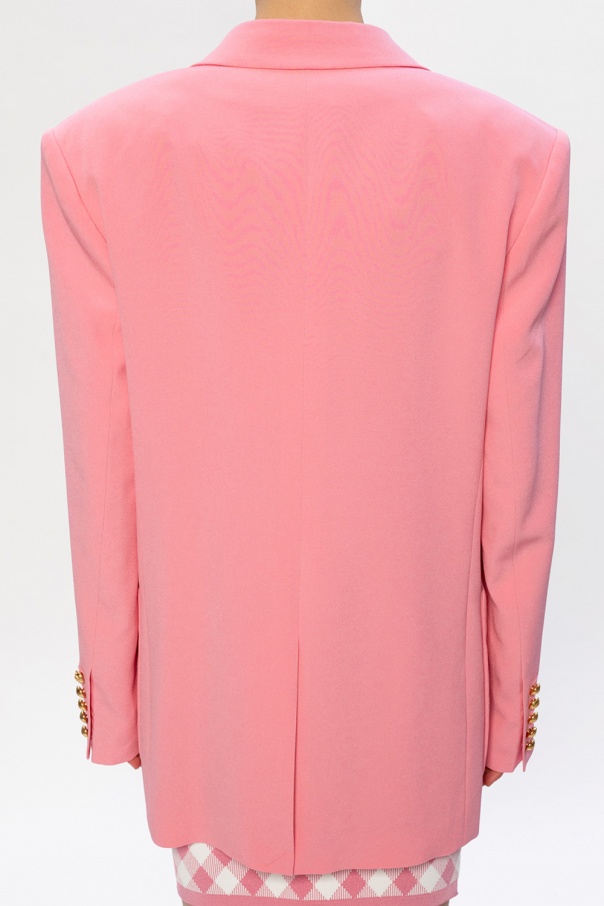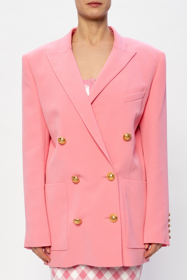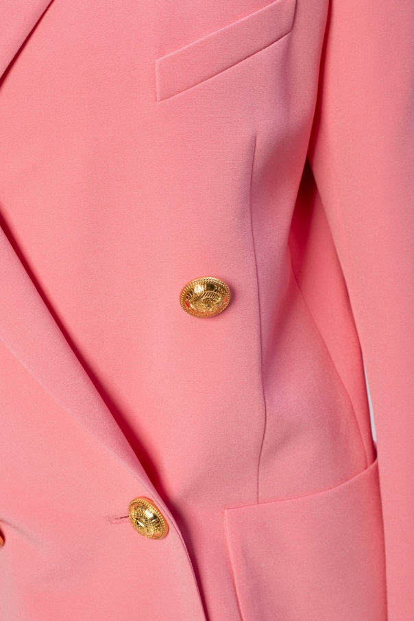 Pink blazer with peak lapels from Balmain. Crafted from wool, this item features button fastening embossed with a logo pattern in gold-tone, peak lapels, two front slip pockets and padded shoulders.