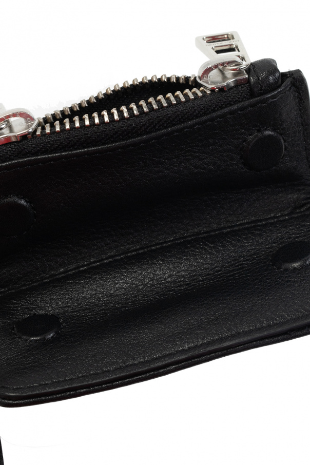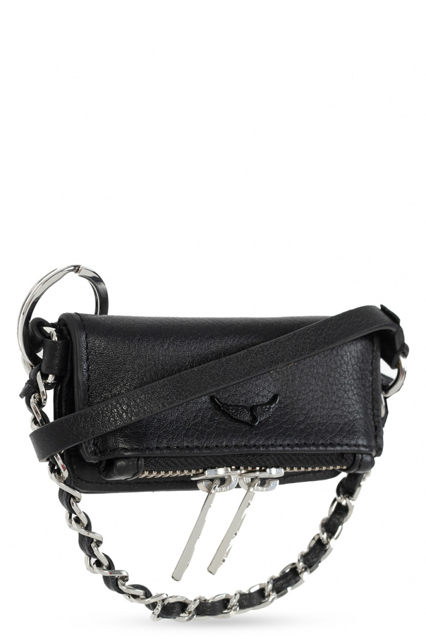 Black key holder from Zadig & Voltaire. Crafted from bovine leather, this design fastens with two-way zip and magnetic snaps. It is complete with the label’s signature wings appliqué, keyring on the side, half-round handle reinforced with a chain, shoulder strap, one internal pocket and silver-tone metal hardware.