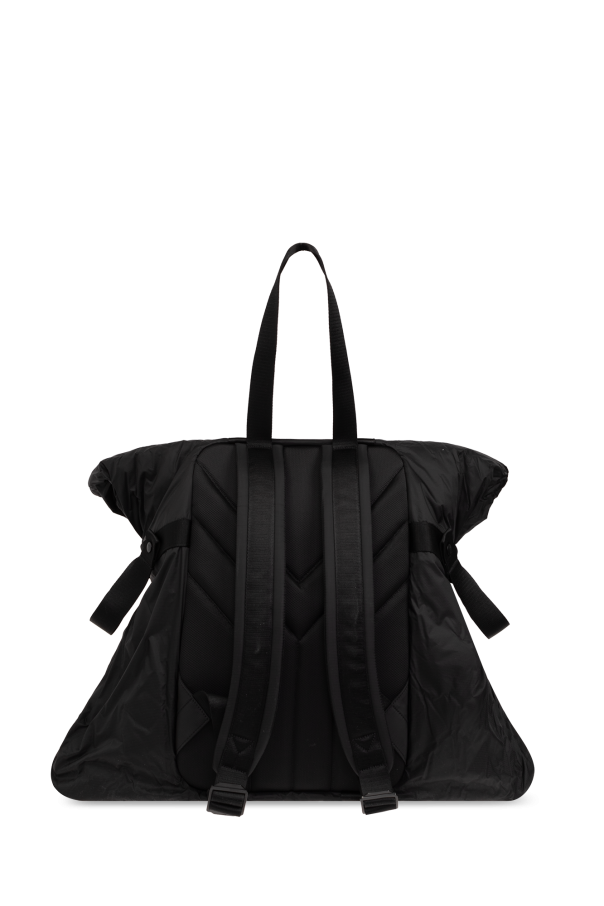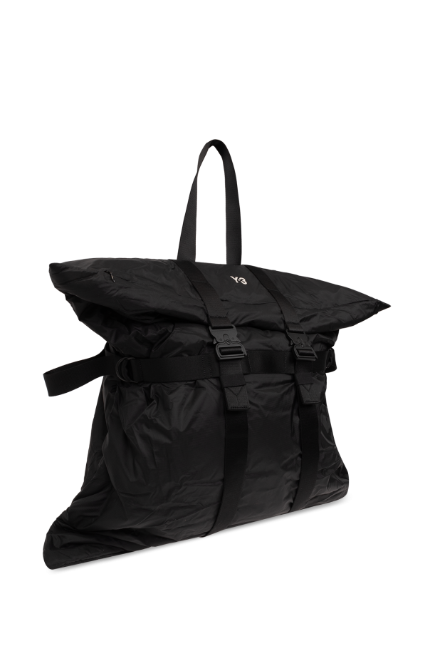 Black backpack from Y-3 Yohji Yamamoto. This design fastens via hidden zip and adjustable buckle straps and showcases a printed white logo on the front, one half-round handle, adjustable shoulder straps, black metal hardware and one internal compartment with one zip pocket and one slip pocket.