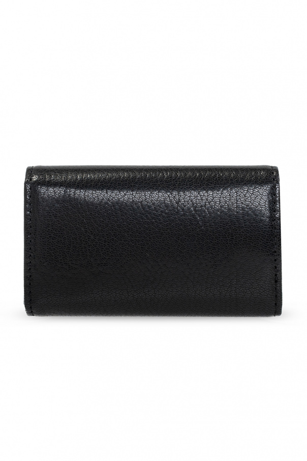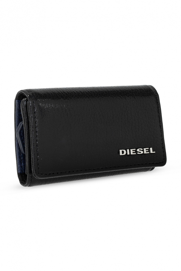 Black key holder from Diesel. Crafted from leather, this item secures with snaps and showcases a silver-tone metal logo plaque and a black and navy blue-clad interior with two slip pockets and lobster clasps.
