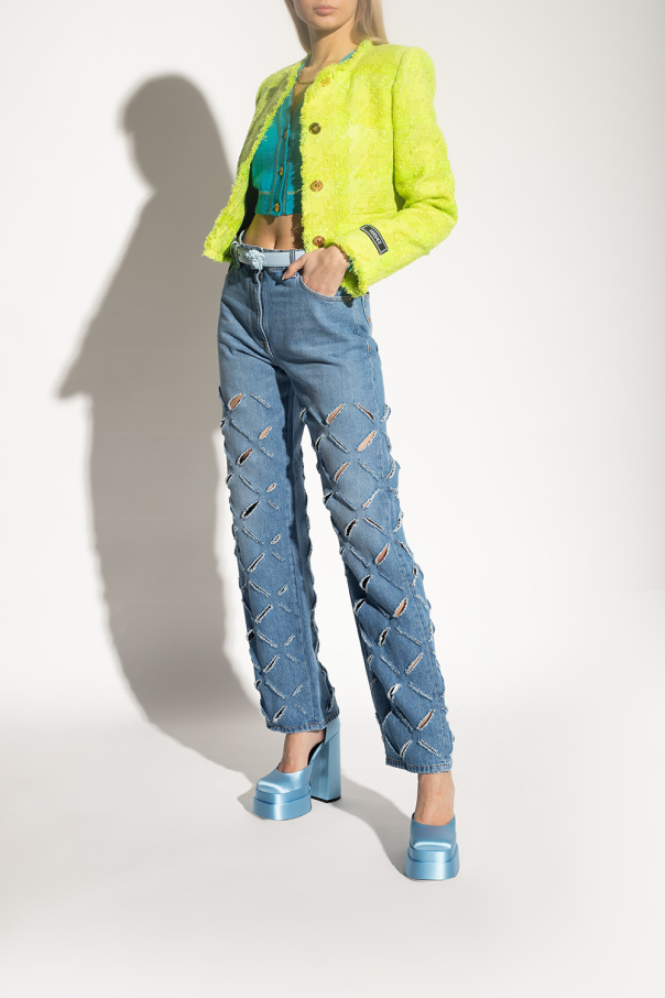 Light blue ‘Medusa Aevitas’ pumps with a double platform from Versace. Made of satin, this pair features an adjustable ankle strap with a buckle embellished with crystals and Medusa head charm, square toe, chunky block heel, gold-tone metal hardware and black calf leather sole.