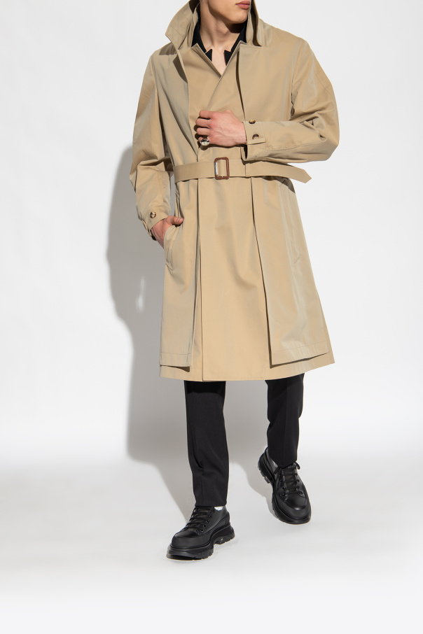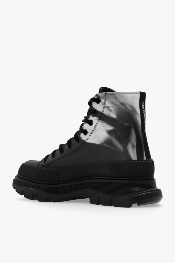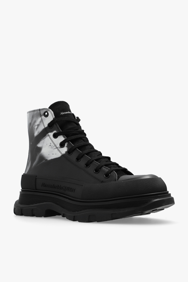 Black ‘Tread Slick’ high-top sneakers from Alexander McQueen. Made of calf leather, this lace-up model sits on a black rubber sole and showcases a white and grey ‘Solarised Flower’ print and logo.