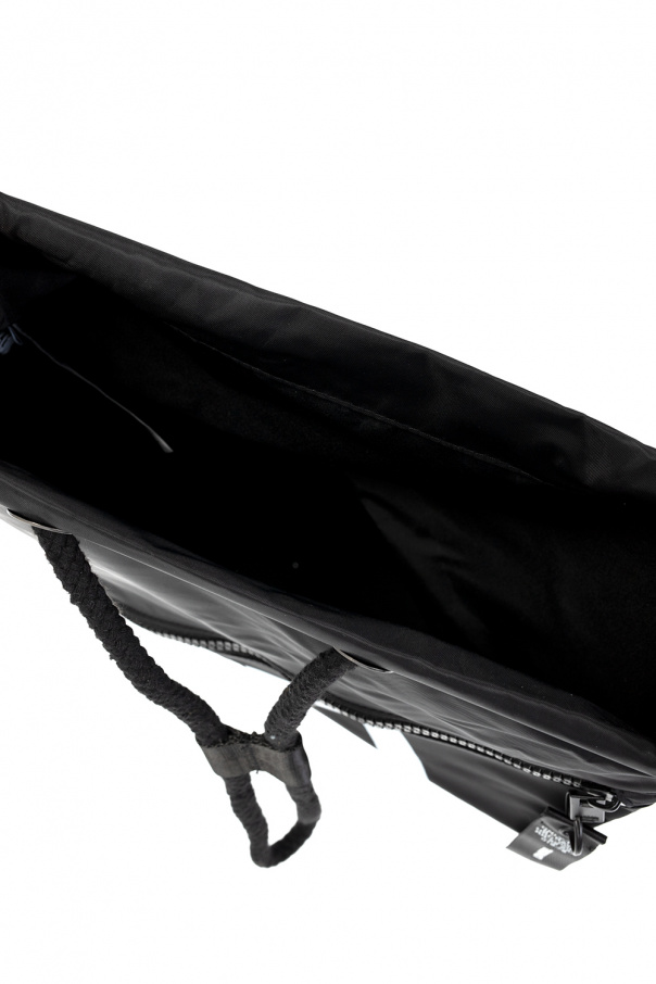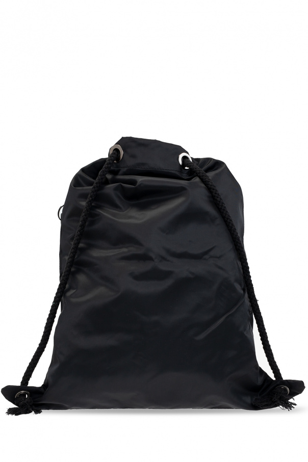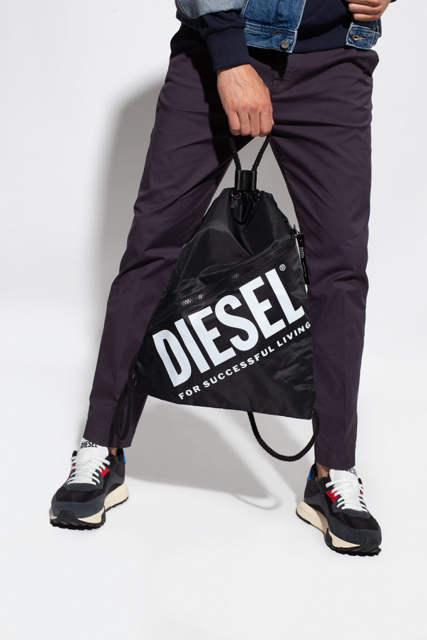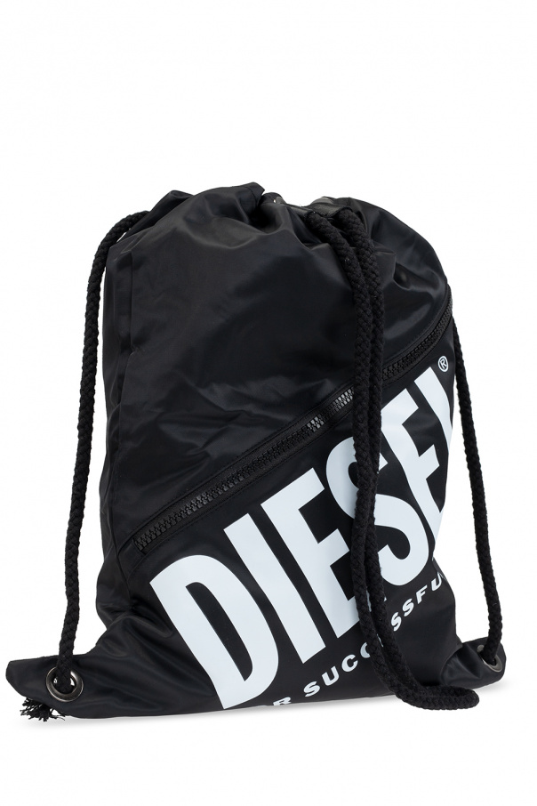 Black gym sack from Diesel. Cinched with drawcords, this item showcases a frontal pocket accompanied by a white logo print.