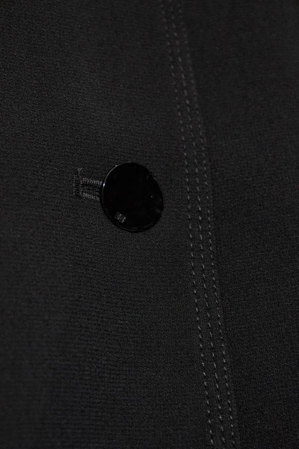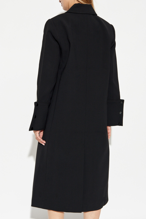 Introducing the Collared Coat from the esteemed fashion house GANNI. This exclusive coat, part of the women's collection, epitomizes sophistication and timeless elegance. Crafted to perfection, it features a long silhouette that gracefully falls below the knees, a classic straight cut with a distinguished collar, and long sleeves adorned with wide, buttoned cuffs. The coat's minimalist design is accentuated by its sleek, black color and the absence of superfluous embellishments. The front is elegantly fastened with glossy black buttons, a subtle yet striking detail. Practicality meets style with two hip-level pockets and two additional chest pockets, all secured with refined flaps. The interior showcases a smooth lining, adding a touch of luxury and comfort. GANNI, a Copenhagen-based brand led by the dynamic duo Nicolaj and Ditte Reffstrup, challenges the notion of Scandinavian fashion as strictly minimalist and androgynous. Their designs blend classic, timeless elements with a relaxed flair, allowing every woman to express herself in an inspiring way. Why Choose This Product? Timeless Elegance: A classic design that exudes sophistication. Premium Materials: Made from recycled polyester, offering both luxury and sustainability. Practical Design: Equipped with four pockets for added convenience. Signature Style: A hallmark piece from the renowned GANNI brand.