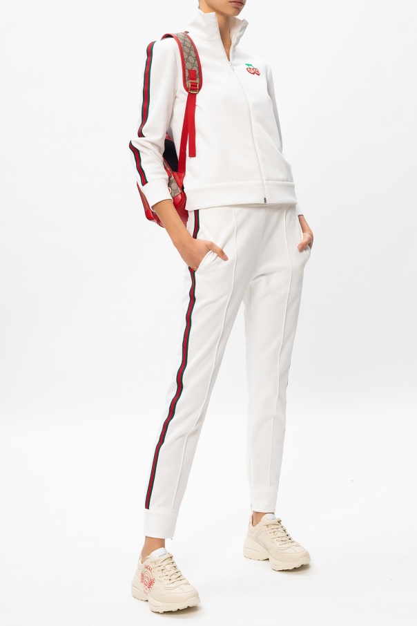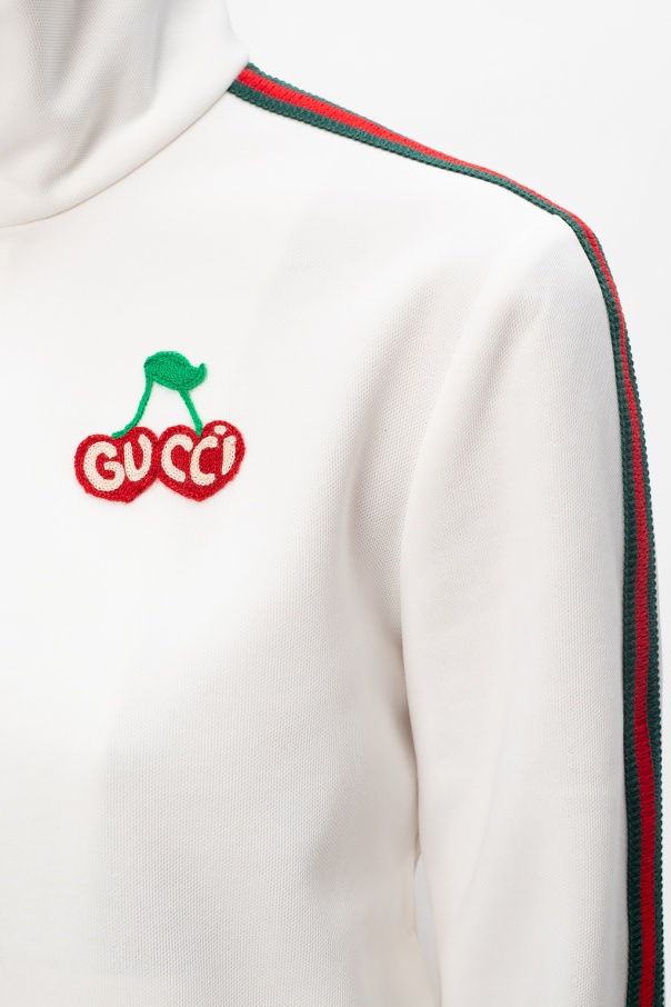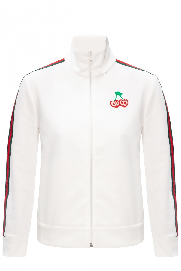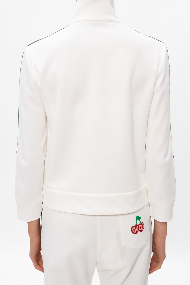 White sweatshirt from Gucci. Fastened with a zip, this item features the brand’s signature red and green Web stripe, a logo patch, two slip pockets and ribbed trims.