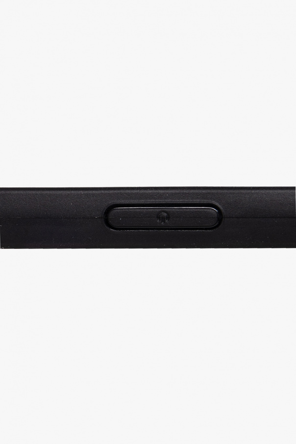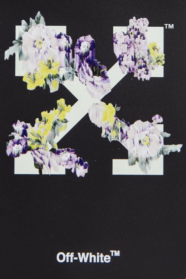 Black iPhone 13 Mini case from Off-White. Designed to guard your smartphone, this item showcases the brand's signature arrows accompanied by a logo in white and a colourful floral motif.