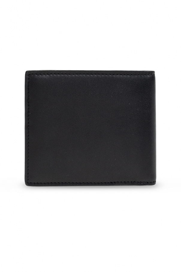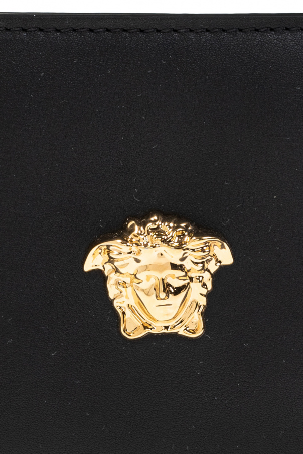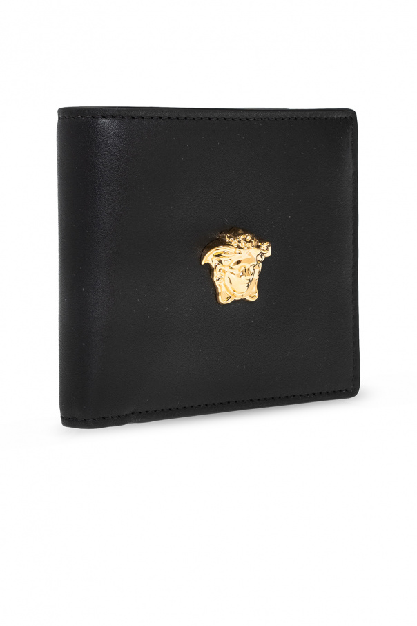 Black bifold wallet from Versace. Crafted from leather, this design is decorated with the label’s signature Medusa head and has two bill compartments, two slip pockets and six card slots inside.