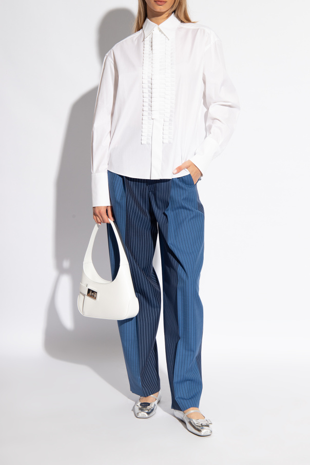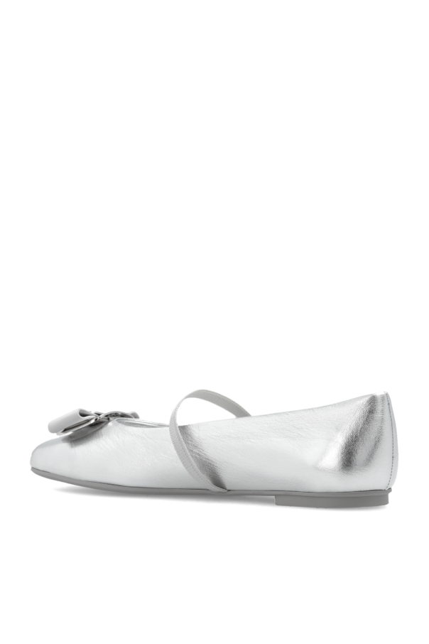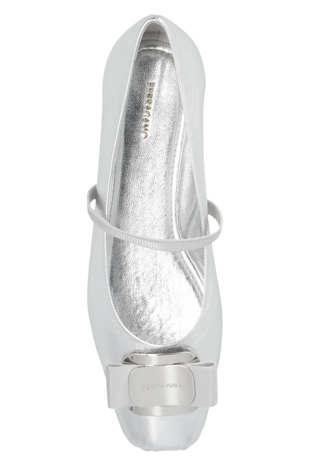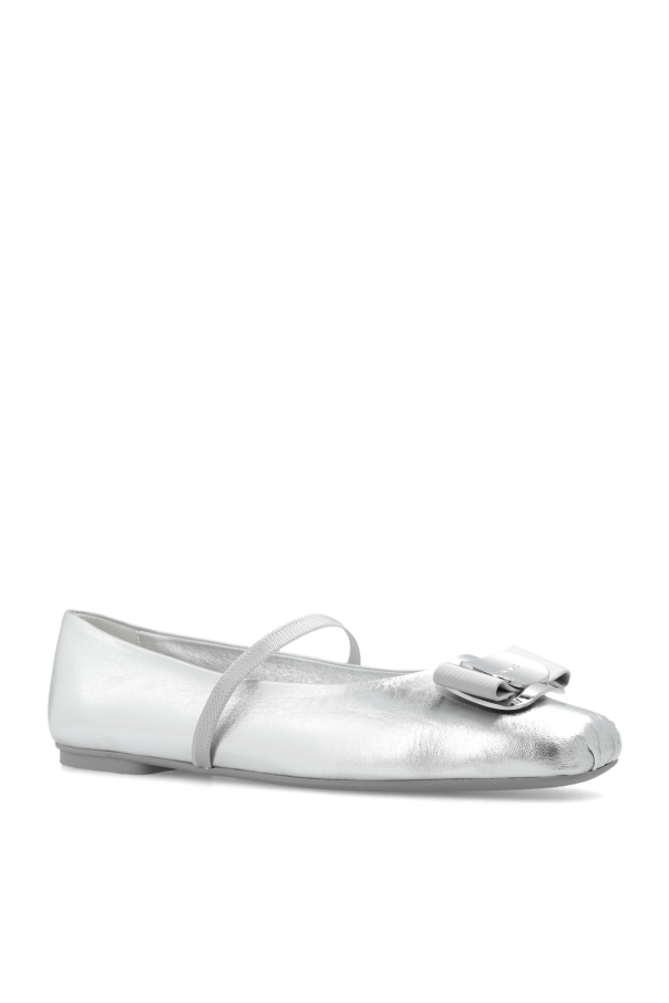 Silver-tone ‘Zina’ ballet flats from FERRAGAMO. Made of leather, this model sits on a grey rubber sole and showcases a logo-engraved bow and an elasticized strap. Standard-width footbed.