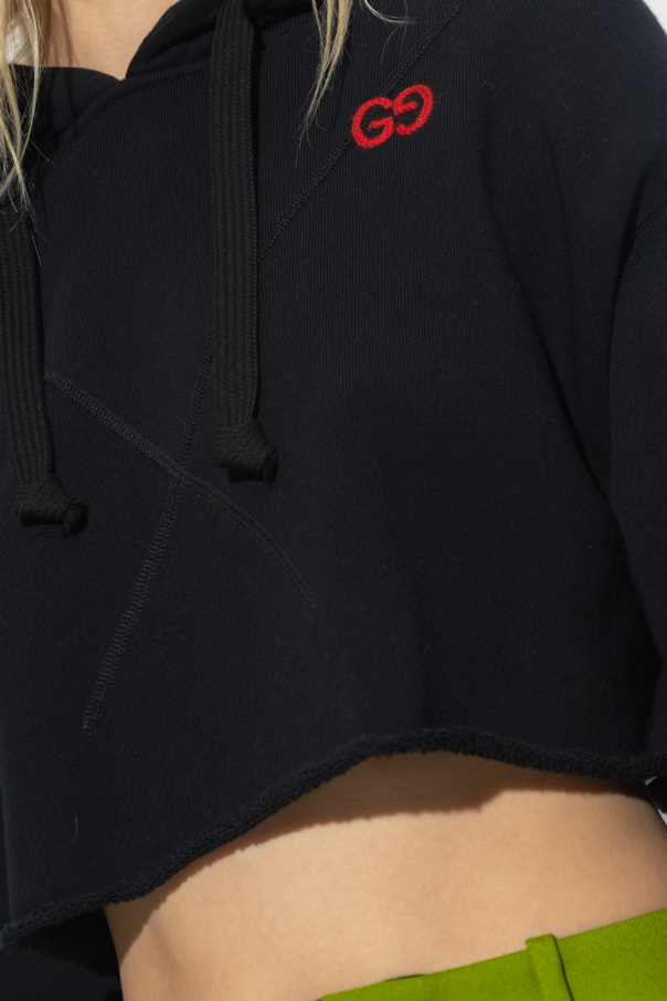 Black sweatshirt with a drawcord-adjustable hood from Gucci. Crafted from cotton with a cropped fit, this style features an embroidered logo on the front, a blue and white sequinned patch at the back, long sleeves and ribbed trims on the edges.