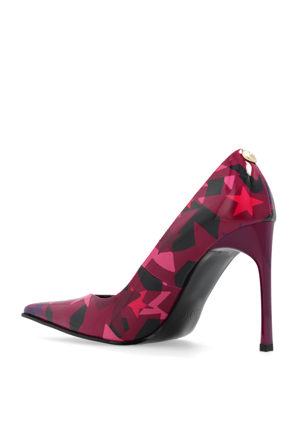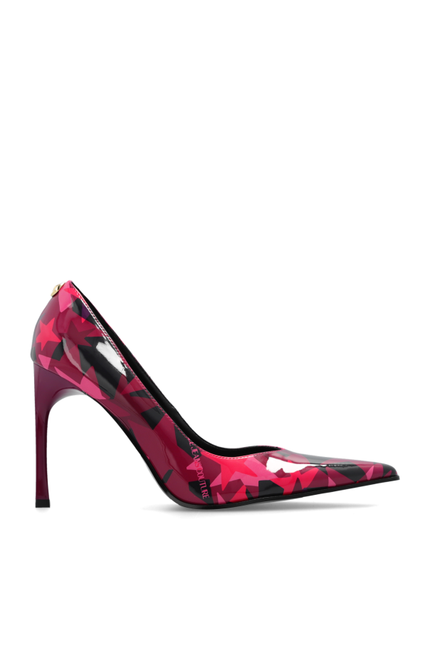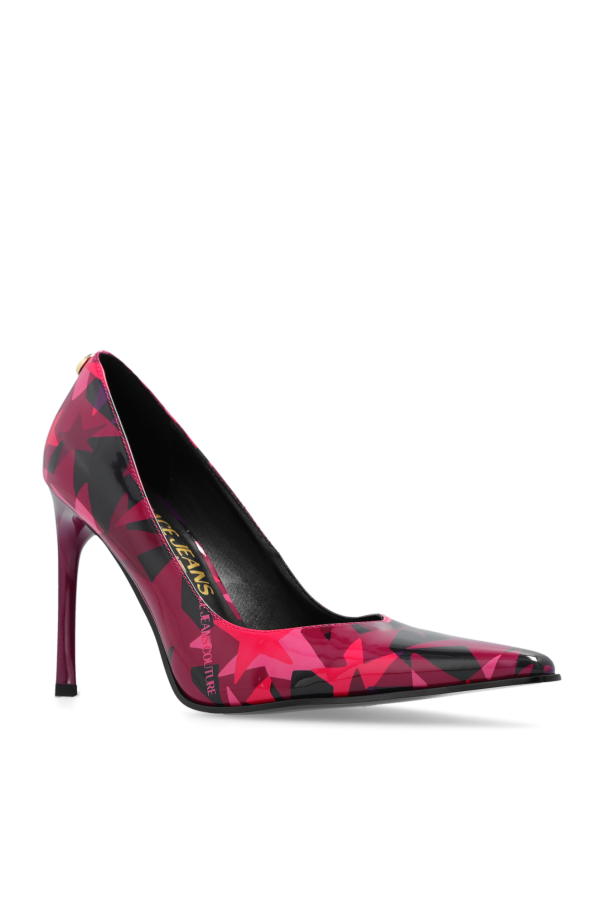 Pink, purple and black stiletto pumps from Versace Jeans Couture. Made of patent faux leather, this pair features a star pattern, logo detail, gold-tone metal appliqué at the back and a black rubber sole.