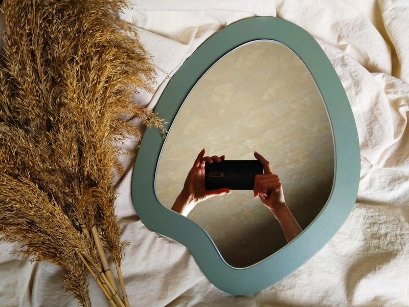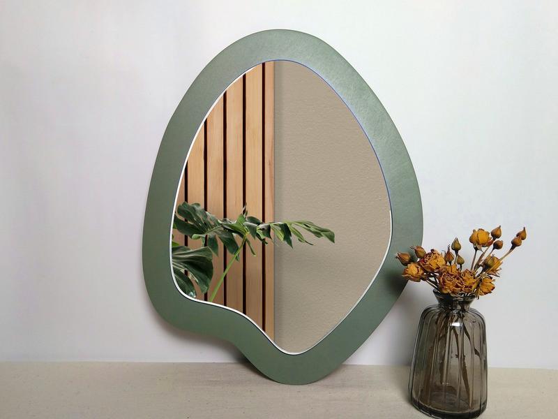 Зеркало в раме цвета шалфея — это стильный элемент для тех, кто ценит минимализм и природные оттенки. Его нестандартная форма привносит в интерьер динамику, делая пространство визуально более интересным. Рама цвета шалфея добавляет свежести и гармонии, идеально сочетаясь с зелёными растениями или деревянными элементами в вашем доме. Это зеркало станет отличным акцентом как в гостиной или спальне, так и в рабочем кабинете, создавая атмосферу спокойствия и уюта.