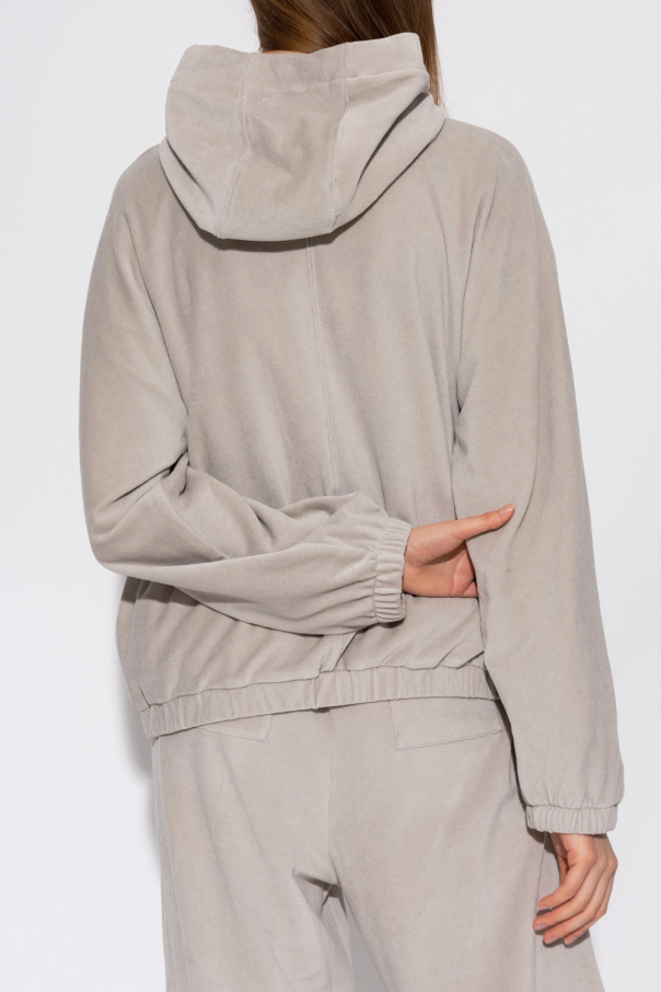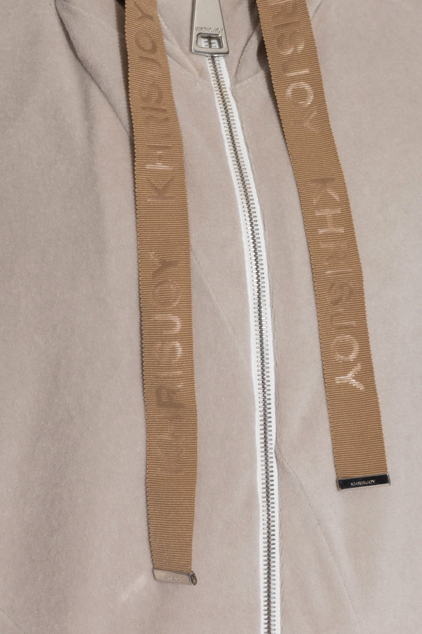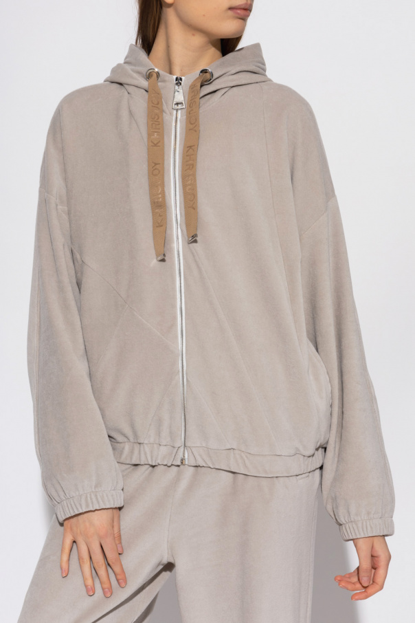 Greyish beige hoodie from Khrisjoy. Made of velour, this garment features a hood with drawstrings with a logo, two front pockets and ribbed trims at the hem and cuffs.
