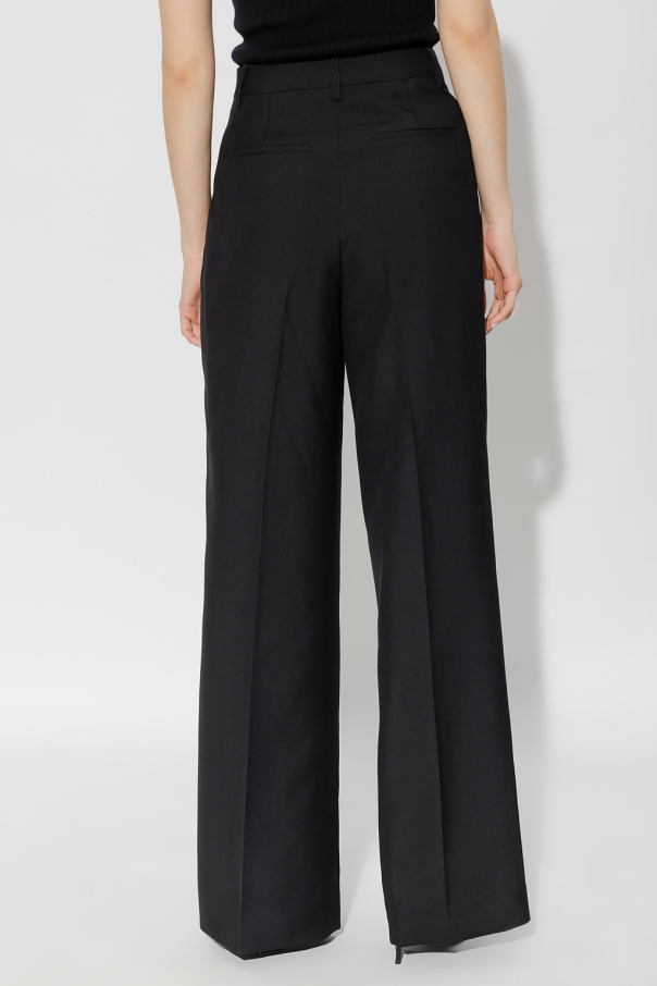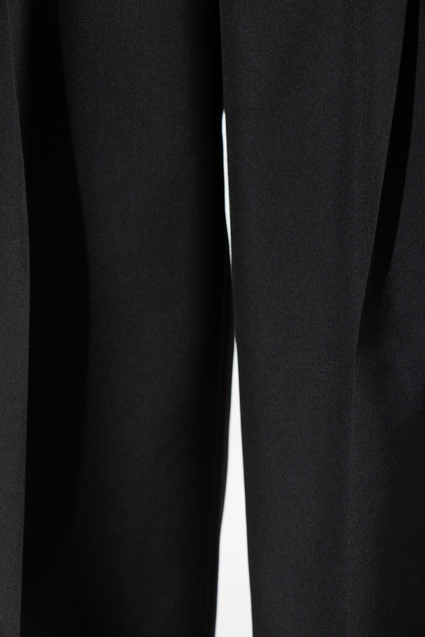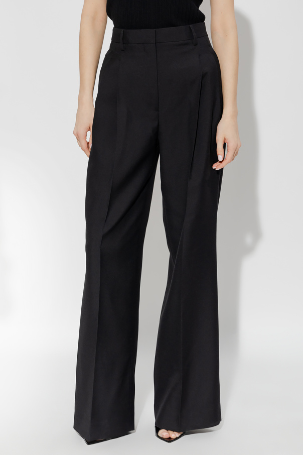 Black ‘Madge’ pleat-front trousers from Burberry. Made of wool with a relaxed fit, this pair features a zip fly with a hook, sharp pleats, two side seam pockets and two back welt pockets.