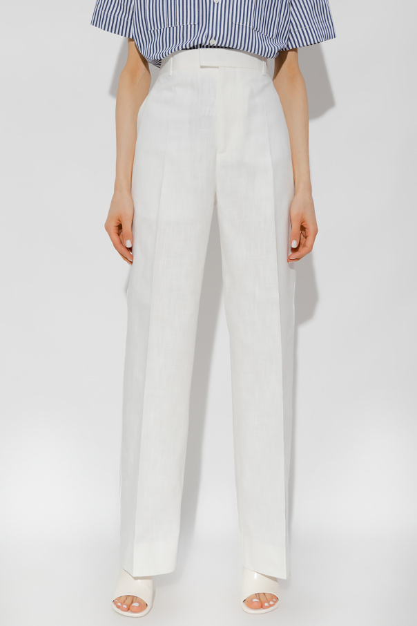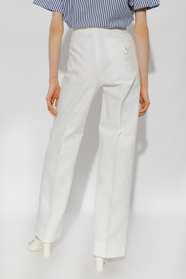 White trousers from Bottega Veneta. Crafted from cotton with a high-rise waist, this pair falls with wide, straight legs with pleats and features a zip fly with a button and hooks, two side seam pockets and two back button pockets.