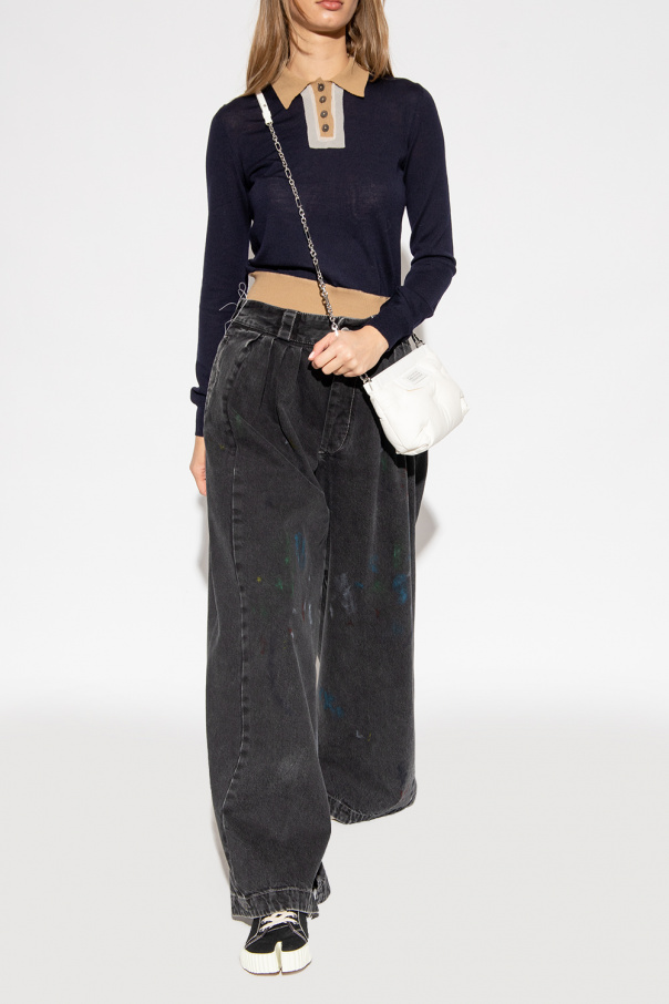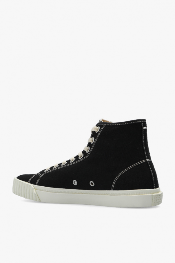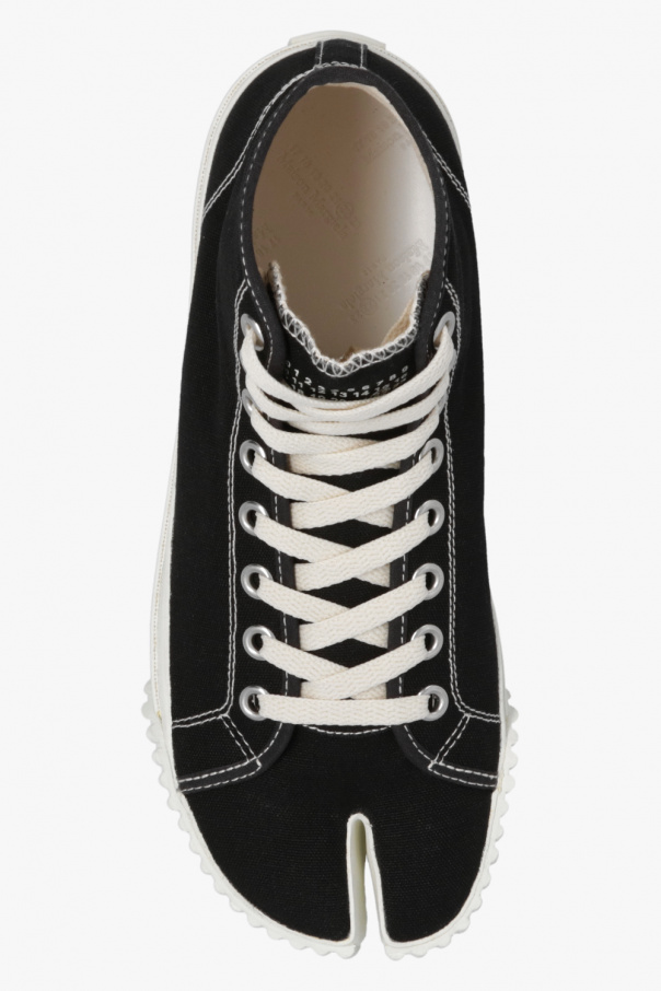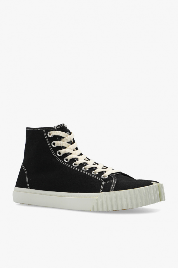 Black high-top sneakers from Maison Margiela. Flaunting the brand's iconic ‘Tabi’ split-toed design, this lace-up model features a printed logo, cream laces and stitching details and a cream rubber sole.